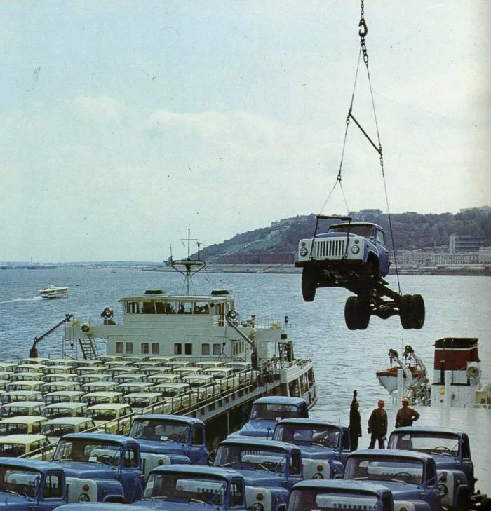 12. Выгрузка продукции Горьковского автозавода, приёмка продукции Волжского автозавода, город Горький, речной порт, СССР, 1983 год
