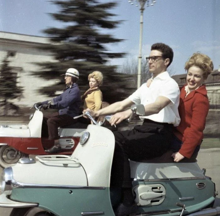13. На мотороллерах Čezeta по центральной алее ВДНХ, Москва, СССР, 1960 год