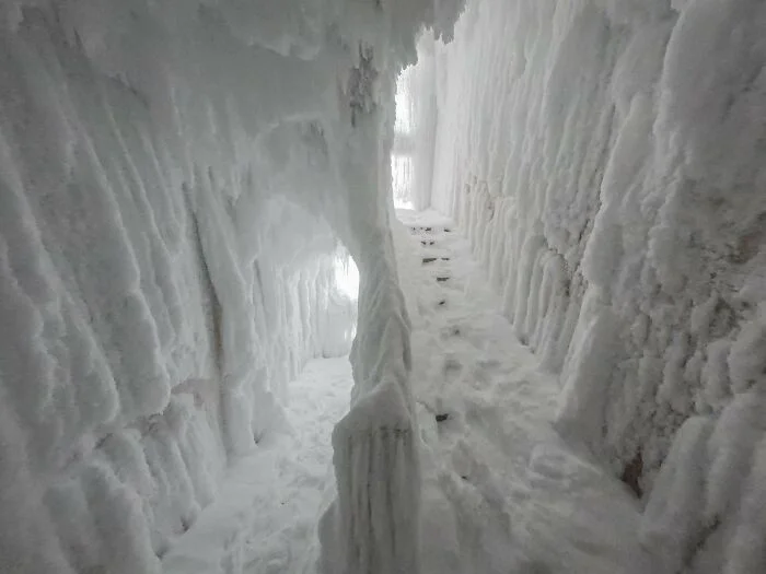 8. Замерзшие лестницы заброшенных жилых домов советских времён в городе-призраке за Полярным кругом