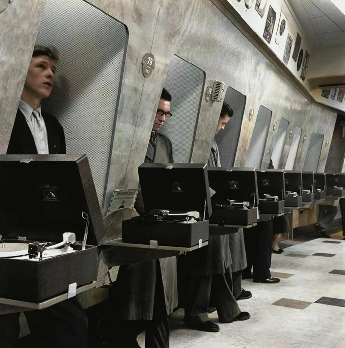 Кабинки для прослушивания виниловых пластинок, 1950-е годы.