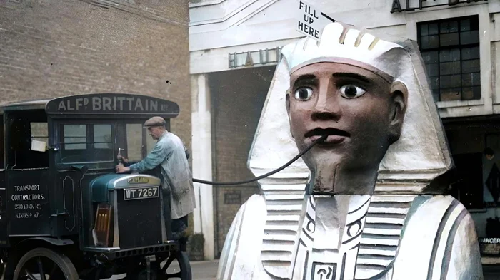 Водитель на заправке в древнеегипетском стиле. Лондон, около 1930 года.