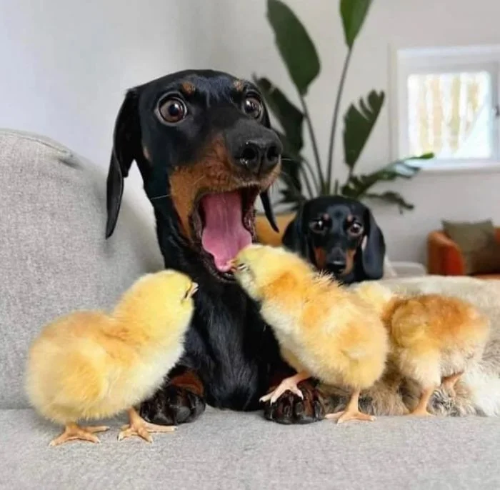 Эта добродушная такса была не готова к тому, что цыплёнок укусит её за язык
