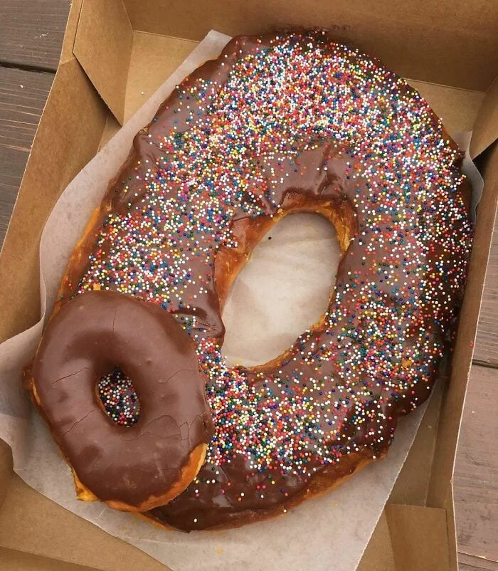 Гигантский пончик, который подают в заведении, в сравнении со стандартным изделием