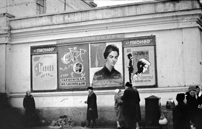 6. Реклaмные афиши кинотеатра "Пионер" на стене магазина "Овощи-Фрукты" в Феодосии.