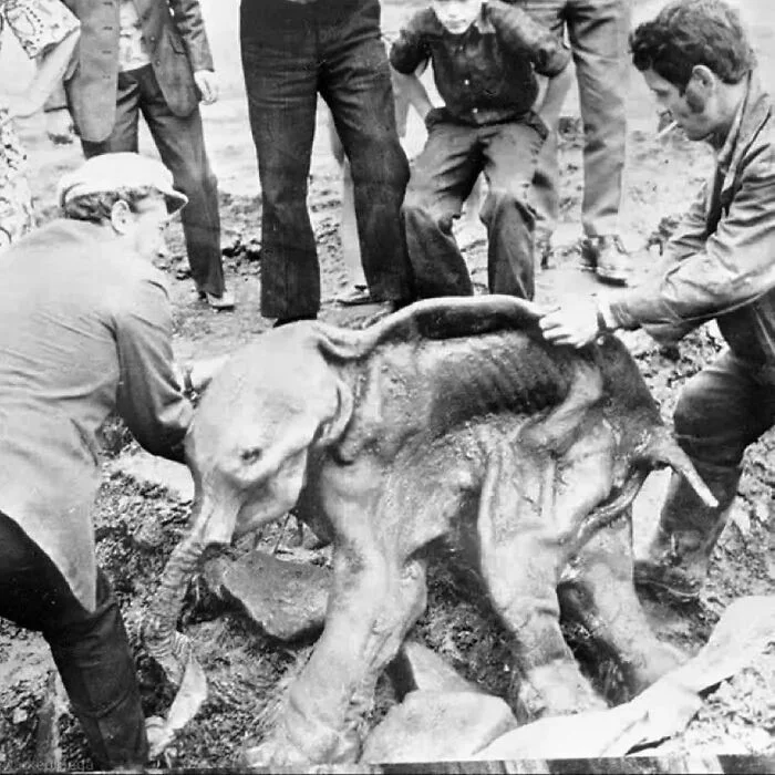 10. Мужчины вытаскивают сохранившуюся тушу мамонтенка, который был случайно выкопан из вечной мерзлоты в Сибири в 1977 году шахтерским бульдозером