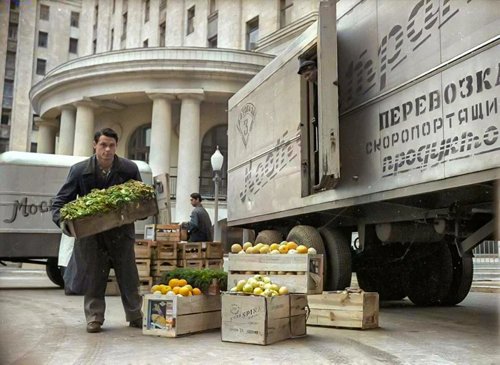 Гостиница «Украина». Разгрузка овощей и фруктов. Москва, 1957 год.