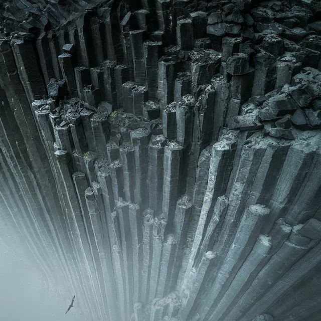 7. Массивные колонны базальтовых скал высоко над туманом в Исландии. Эти столбы созданы базальтовой лавой, которая охлаждается иначе, чем обычная лава, в процессе, называемом столбчатым соединением, создавая таким образом эти формы