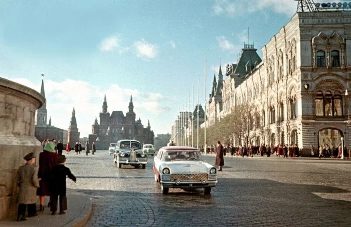 17. Автомобильное движение на Красной площади. Снимали здесь, кстати, именно "Чайку" - это предсерийный образец автомобиля.