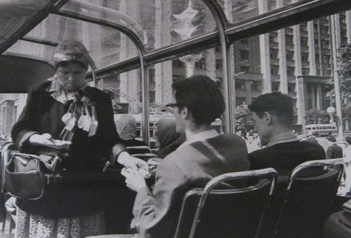 18. Кондуктор и пассажиры в очень необычном троллейбусе СВАРЗ ТБЭС, который изнутри очень походил на аквариум.