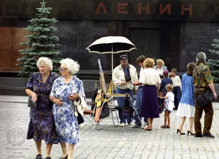 35. Уличный художник предлагает свои услуги прямо у мавзолея на Красной площади, 1996 год