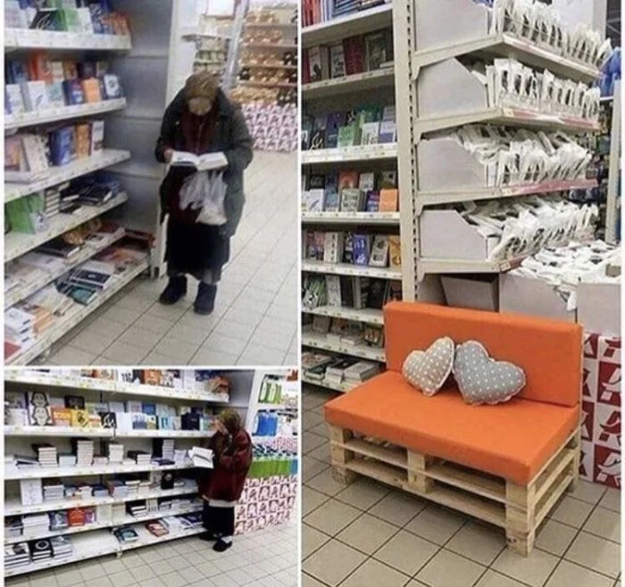 11. Эта бабушка ходит в магазин за книгами уже 15 лет. Владельцы поставили этот специальный диван так, чтобы ей было удобно