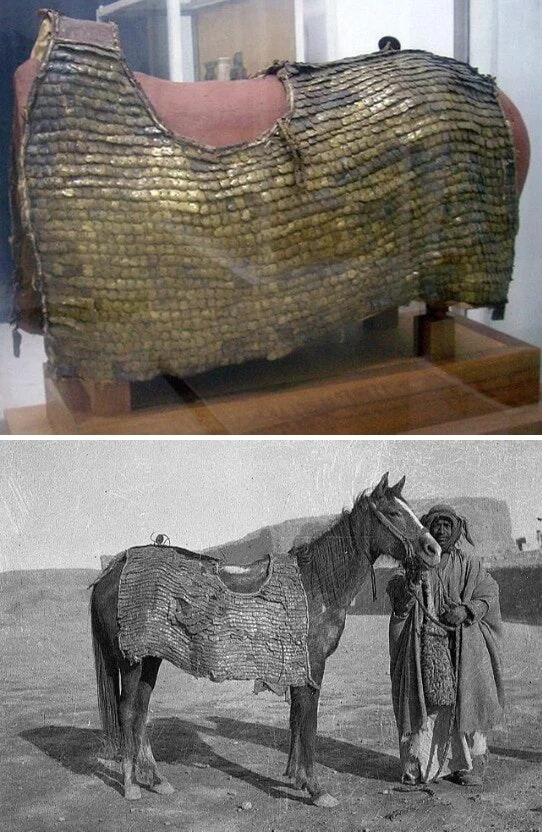 Римский конский доспех 3 века нашей эры, состоящий примерно из 2000 бронзовых чешуек. Найден в Дура-Европос, Сирия