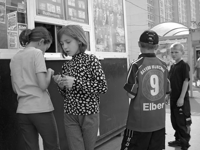 Дети обдумывают покупку возле ларька. Россия, 1990-е годы.