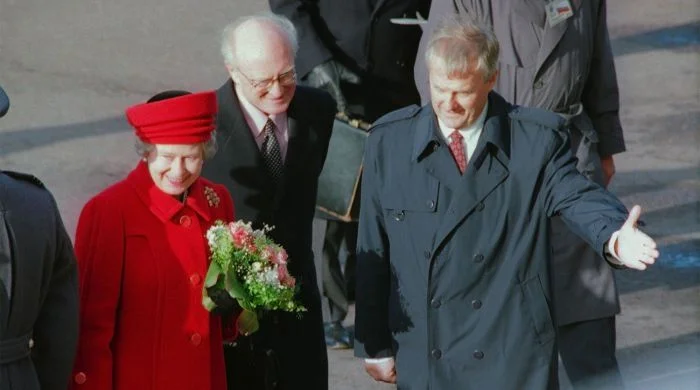 13. Королева Великобритании Елизавета II и мэр Санкт-Петербурга Анатолий Собчак в аэропорту Пулково во время визита королевы в Россию, 1994 год.