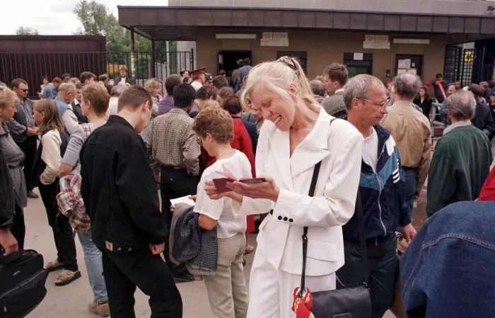 14. Люди у посольства Германии в Москве, август 1998 года.
