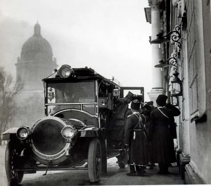14. Николай Второй выходит из автомобиля Delaunay-Belleville перед зданием Сената на Сенатской площади.