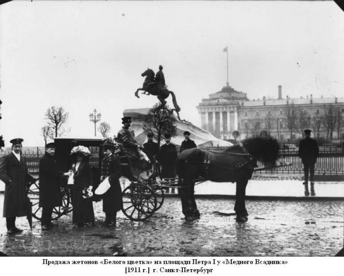 18. Продажа жетонов в пользу благотворительного общества по борьбе с чахоткой в день «Белого цветка» рядом с Медным Всадником.