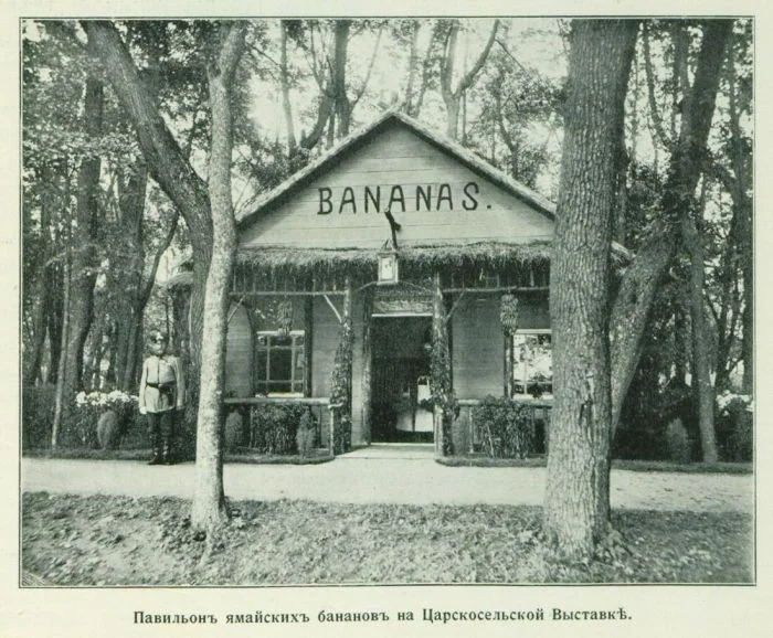 А вот что про этот павильон писали в газетах Петербурга того времени: Незатейливость постройки, чрезвычайная упрощенность и оригинальность – все это привлекало к павильону ямайских бананов. Простой шалаш торговца бананами переносил зрителя в далекие жаркие страны, где зреют эти вкусные плоды. Кстати, на начало 20-го века организация продажи бананов была хорошо поставлена только в Санкт-Петербурге, Москве и Риге, несмотря на то, что эти экзотические фрукты считались тогда более питательными и здоровыми, чем яблоки и апельсины