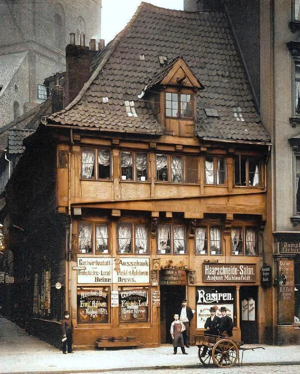 На этой фотографии, сделанной в 1898 году, старейший дом в Гамбурге, Германия. Он был построен в 1524 году. Несмотря на протесты местных жителей, в декабре 1910 года дом снесли.