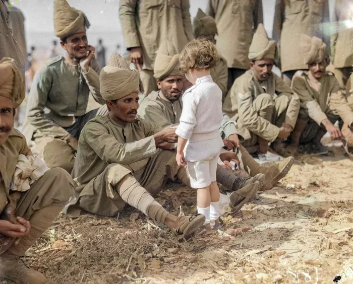На фото запечатлен французский мальчик и индийские солдаты, которые прибыли во Францию. Марсель, 30 сентября 1914 года.
