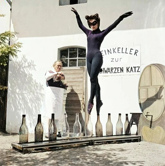 17-летняя Бьянка Пассарге из Гамбурга танцует на винных бутылках в костюме кошки, 1958 год.