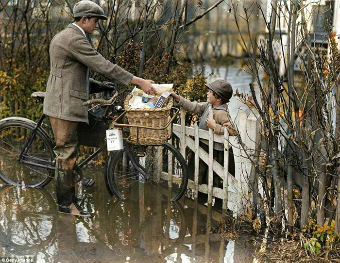 Мужчина на велосипеде доставляет продукты жертве наводнения в Шеппертоне, 1926 год.