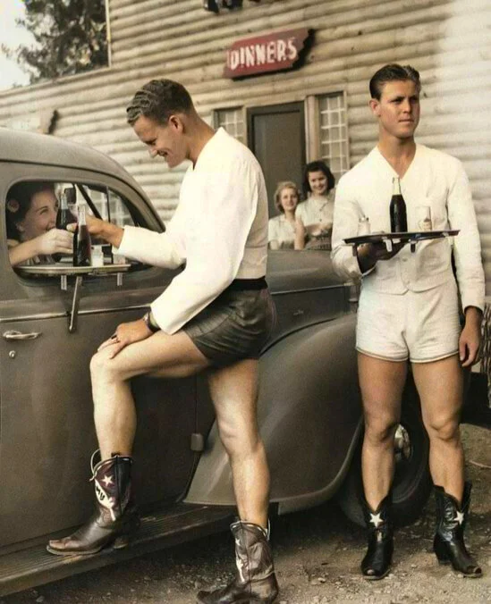 Мужчины, одетые в шорты и ковбойские сапоги, обслуживают женщин на проезжей части в Далласе, штат Техас, 1940-е годы.