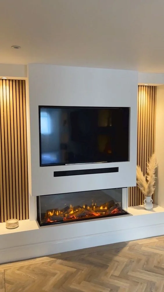 6. Встраивание камина и телевизора в стену с нишами для хранения по бокам создаст аккуратный и упорядоченный вид. Это решение подходит для современного и минималистичного стиля