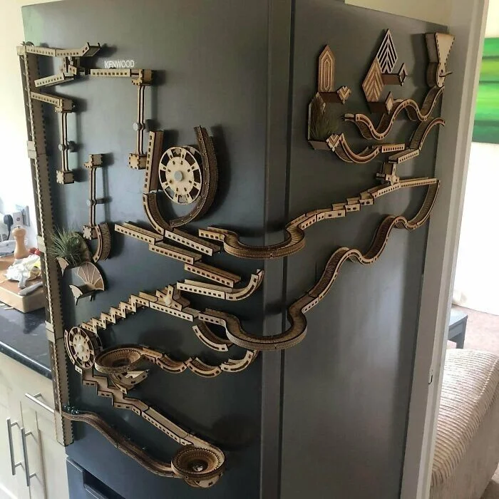 "Вот такую магнитную горку для спуска шариков я построил прямо на холодильнике"