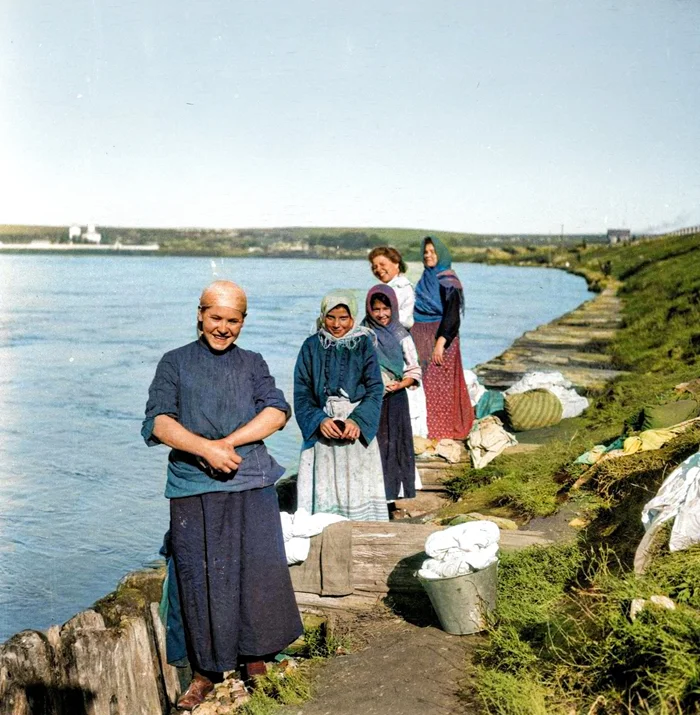 Прачки на Ангаре. Вид на Иркутский женский Знаменский монастырь, 1902-1905 год.