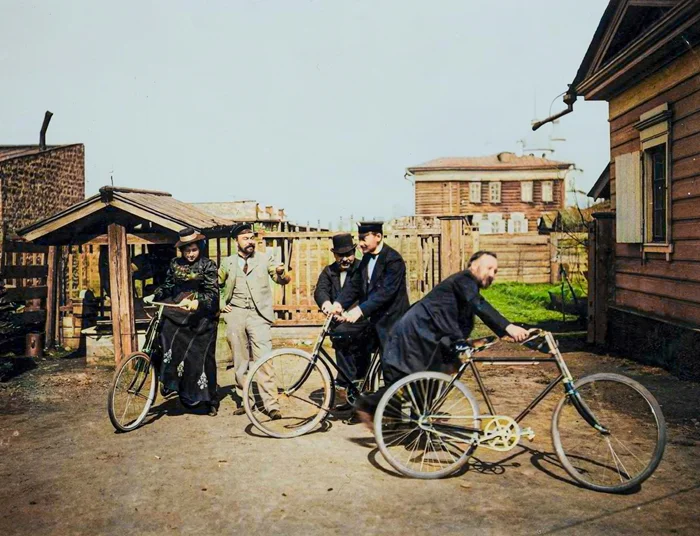 Велосипедисты во дворе усадьбы, 1900-1910 год.
