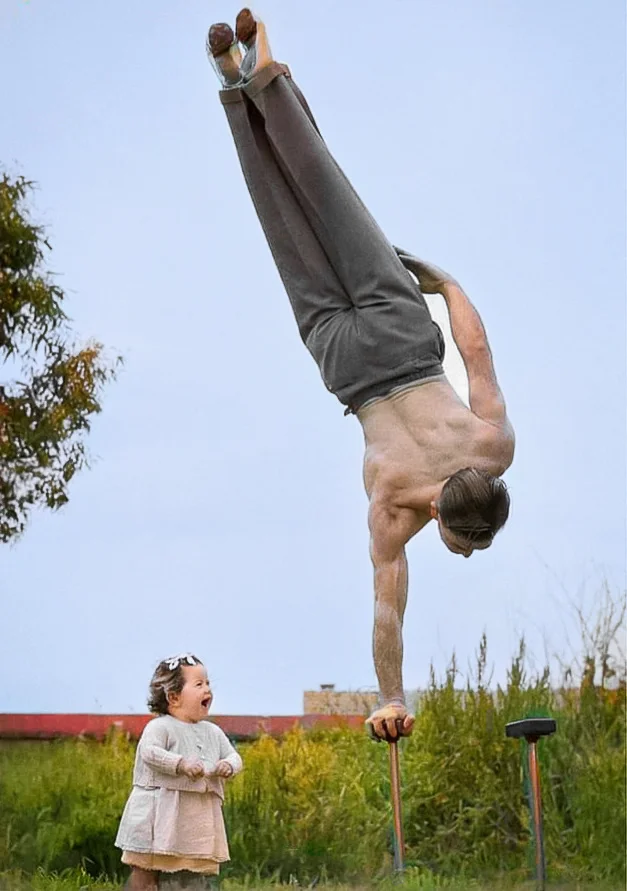 Папа демонстрирует свое мастерство, к удивлению своей маленькой дочери, в Мельбурне, Австралия, 1940-е годы.