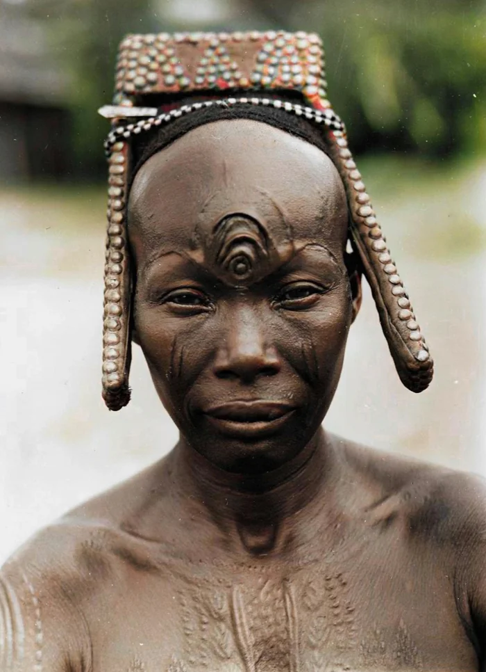 На лице у девушки результат шрамирования, — специальное нанесение на тело шрамов, в законченном виде представляющих собой какой-либо рисунок или узор.