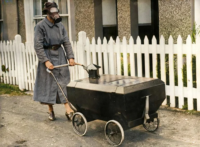Женщина с ребенком в коляске, готовые к газовой атаке. Лондон, 1938 год.