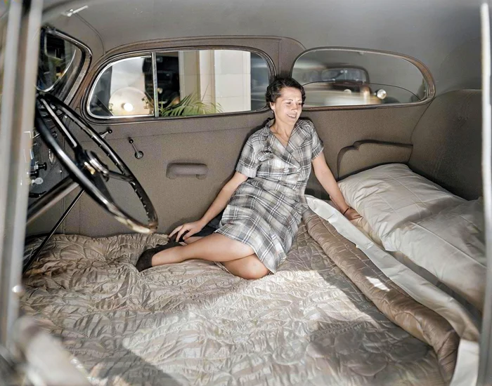 Сиденья автомобиля складывались, превращаясь в ровную мягкую поверхность, на которой можно было спать.