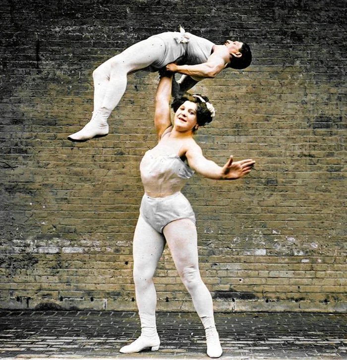 Цирковая силачка Кейт Брумбах, больше известная, как Великая Сандвина (1884 - 1952) поднимает своего мужа над головой.