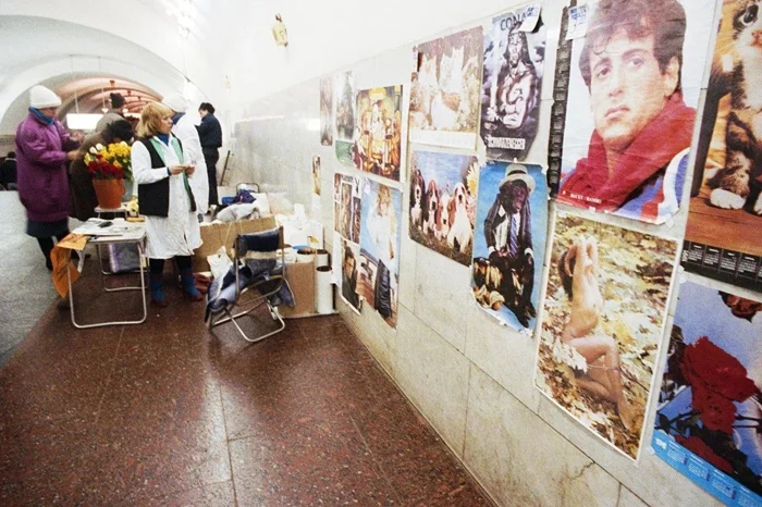 Торговля кооперативными плакатами и календарями в переходе станции метро «Баррикадная». Москва, 1990 год.