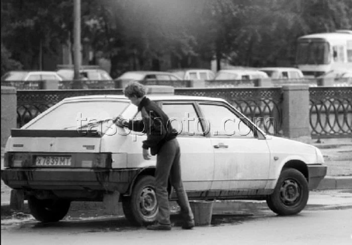 Юный бизнесмен моет автомобиль на набережной. Москва, 1993 год.