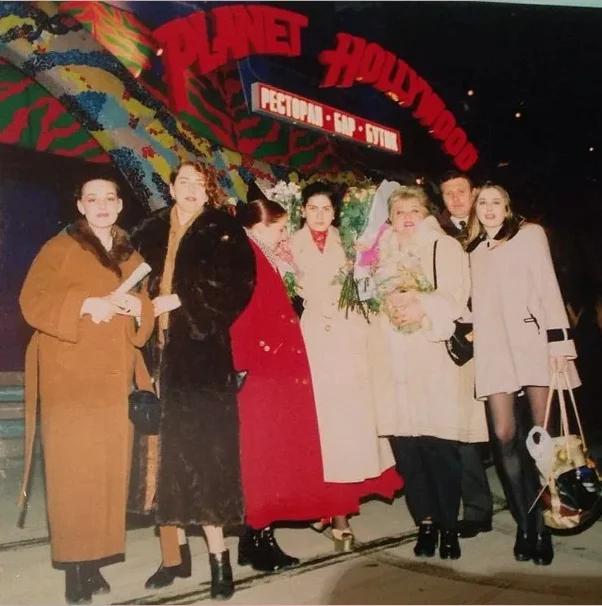 Люди возле входа в ресторан «Планета Голливуд» в Москве, 1990-е годы.