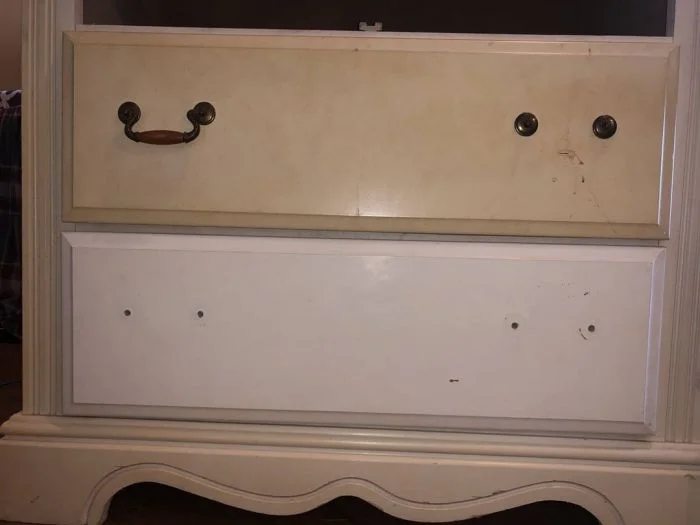 Верхний ящик: 20 лет курения в доме. Нижний ящик: час чистки тринатрийфосфатом. Унаследовал дубовый спальный гарнитур моей бабушки. Она курила по 2 пачки в день в течение 40 лет своей жизни.