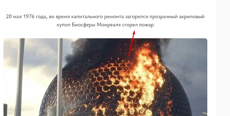 20 мая 1976 года, во время капитального ремонта загорелся прозрачный акриловый купол Биосферы Монреаля сгорел пожар
