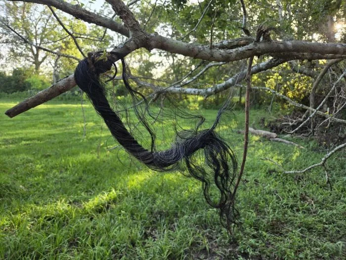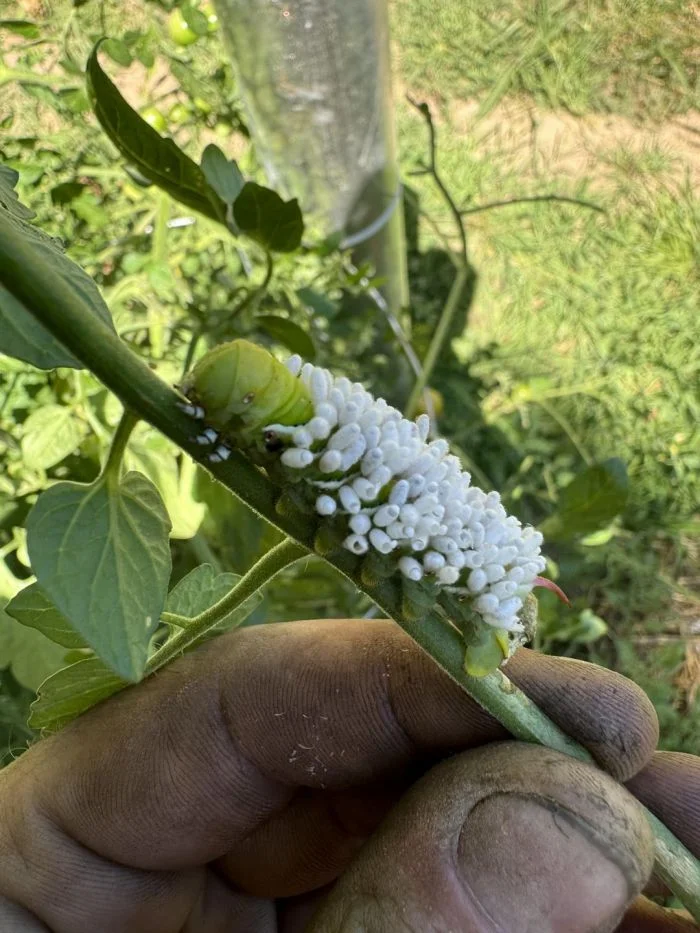 "Такие гусеницы питаются листьями томатов и в конце концов превращаются в бабочек-бражников. Под кожу этой бедняги отложили яйца паразитические осы-бракониды. Она ослабла настолько, что скоро умрёт".