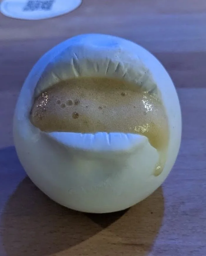 Цитрусовая пенка в ёмкости в виде гипсового слепка ротовой полости шеф-повара. Похоже, что идея подачи позаимствована из какого-то безумного ужастика.