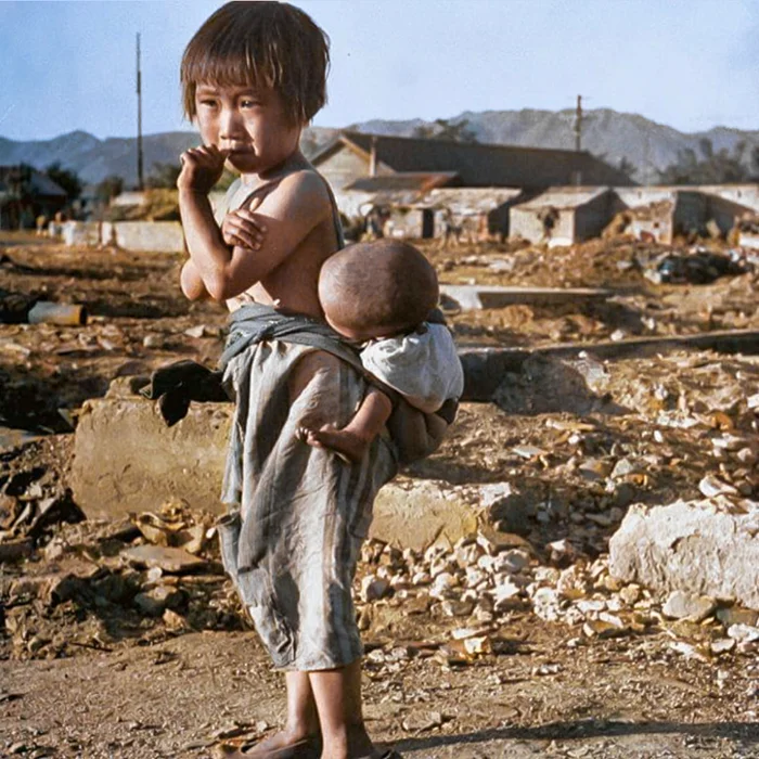 Девочка сирота со своим младшим братом посреди развалин города во время Корейской войны, 1950 год.