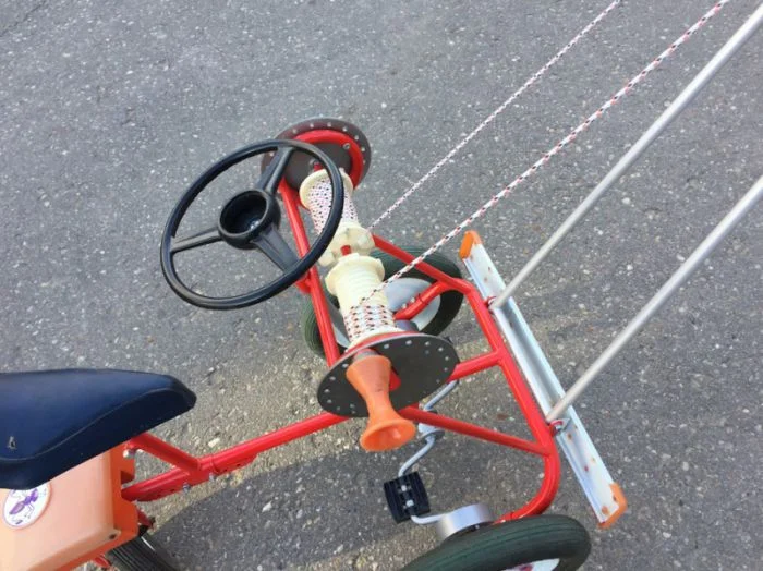 Но это все - просто "цветочки", настоящее удивление вызывает механизм управления всей этой конструкцией. Руль и заднее колесо связаны между собой тягой, которая расположена внутри рамы. Если "Муравей" едет прямо, то привод приходится на два передних колеса, стоит только повернуть руль, привод в этой стороне от колеса отключается - так ребенку будет легче поворачивать.