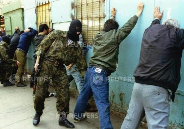 12. Бойцы ОМОНа обыскивают задержанных во время рейда на одном из московских рынков, 1993 год.