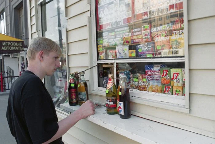 22. Парень выбирает товар в ларьке. Москва