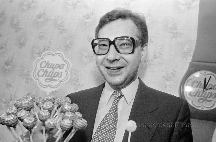 25. Счастливый Глава АО "Нева Чупа-Чупс" Андрей Прокопов с продукцией. Москва, 1993 год
