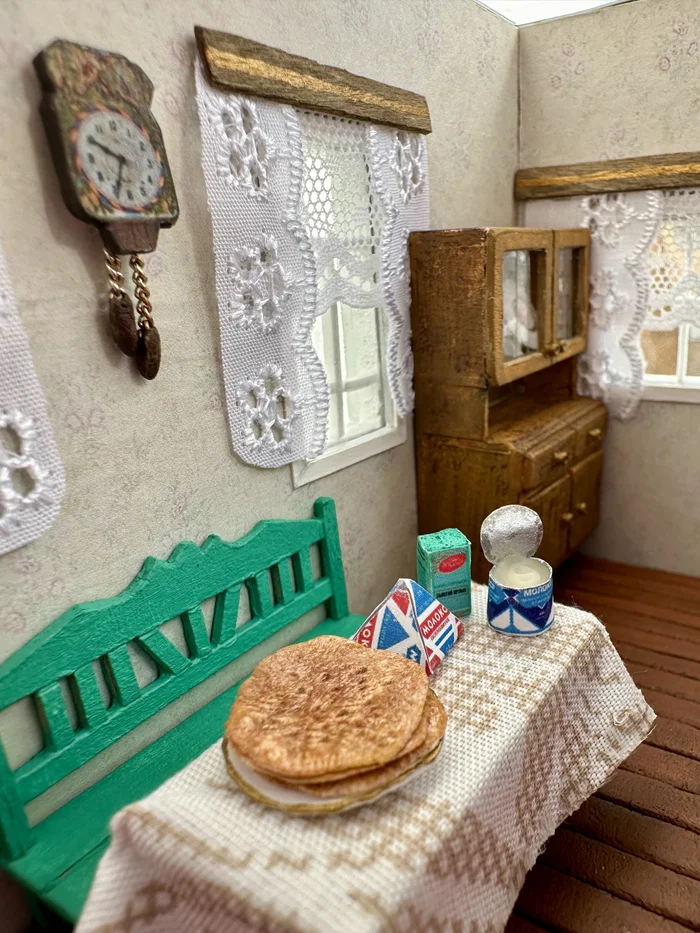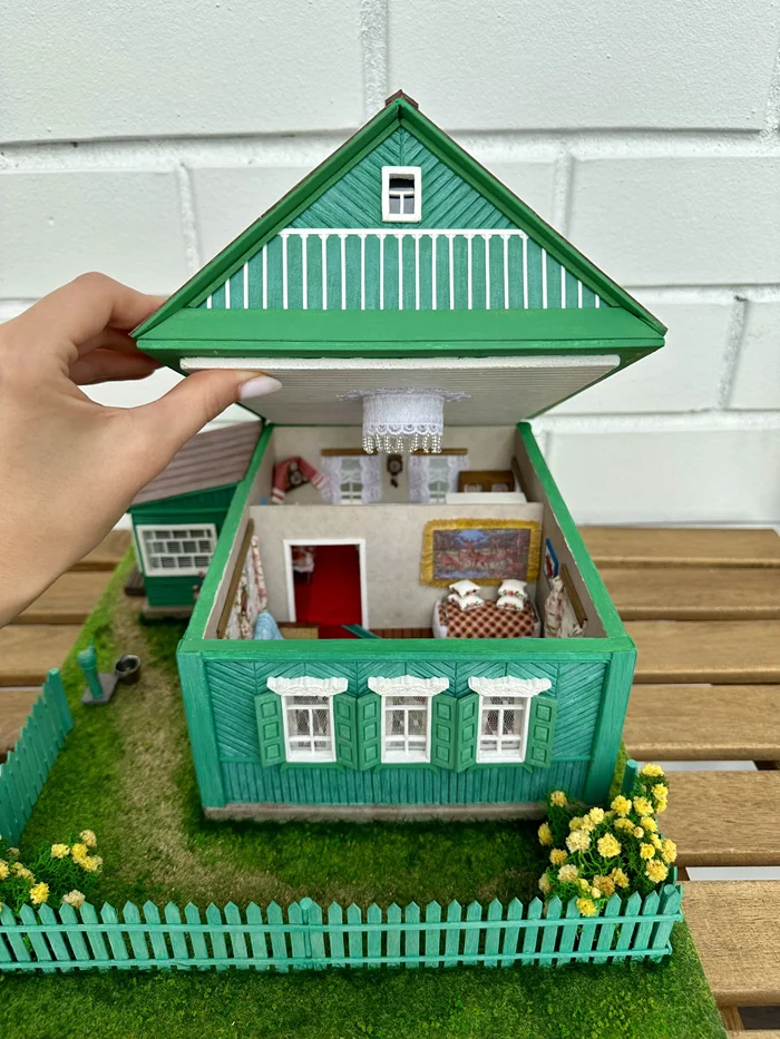 Внутреннее убранство дома - это собирательный образ оригинала. К сожалению, в маленький домик невозможно поместить все комнаты и всю мебель, иначе он перестанет быть маленьким и поставить его можно будет разве что на кухонный стол)) Поэтому, заказчик выбрал наиболее памятные предметы мебели, которые мы разместили примерно также, как было раньше.