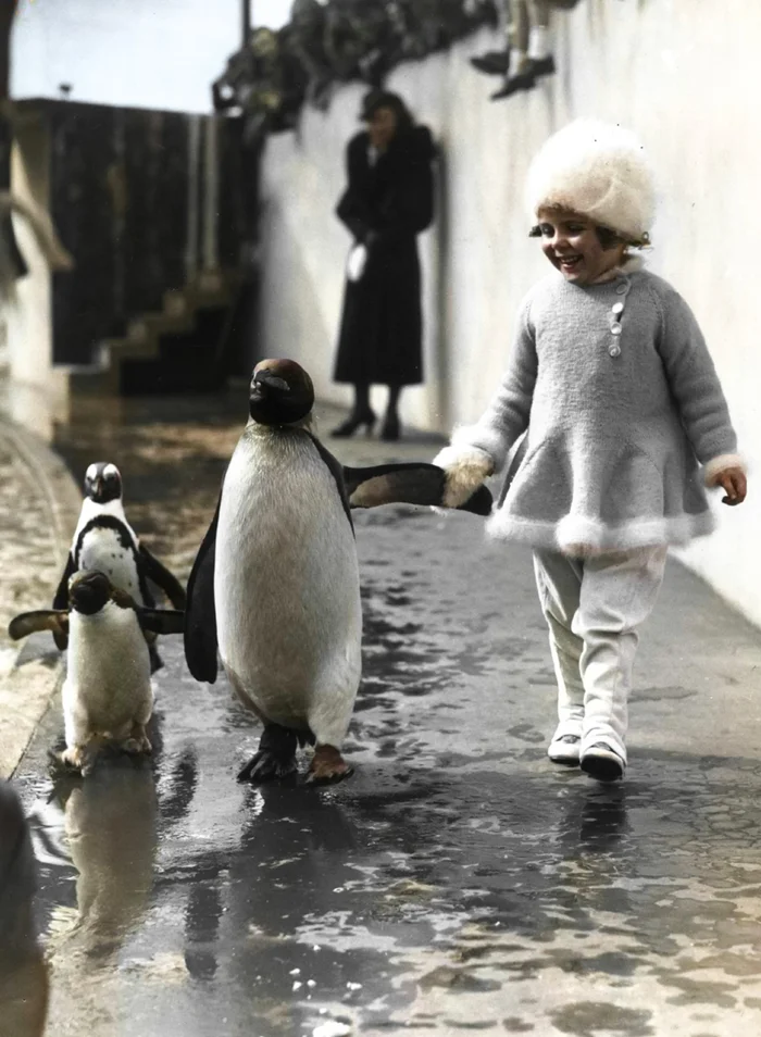Девочка прогуливается с пингвинами в Лондонском зоопарке в 1937-ом году.